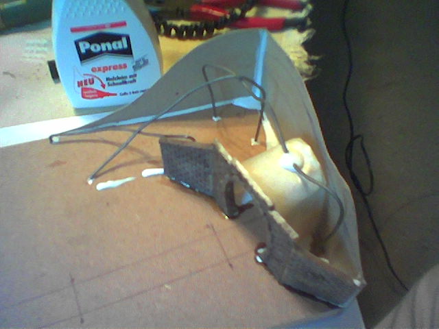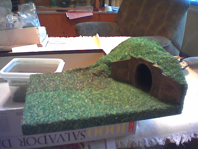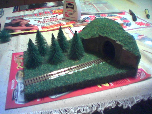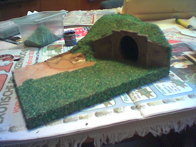 Zuerst wurde das Tunnelportal auf einer Holzplatte geklebt und der Bereich um den Tunnel mit Draht und Pappe gestaltet. Darüber wurden einige Schichten Pappmasche (Holzleim mit Zeitungspapier) gelegt und die Form des Felsens gestaltet. Das Innere des Tunnels wurde schwarz angestrichen.